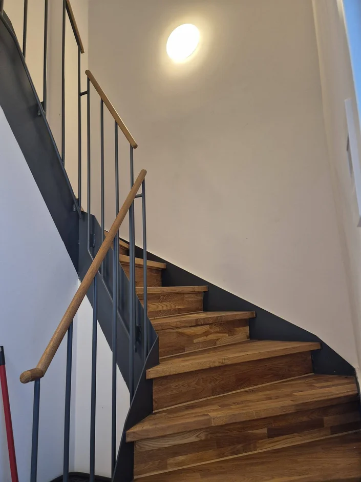 The internal staircase was completed with wooden treads and metal railing elements. Precise alignment and secure fixing were essential to ensure safety, comfort, and visual clarity. -