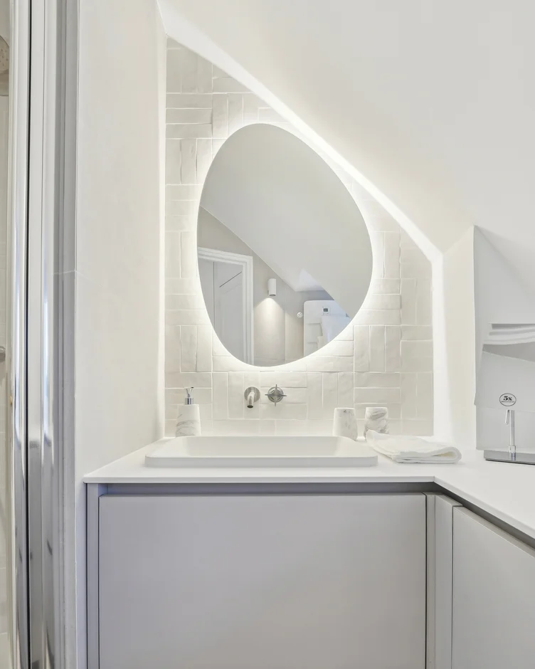 Bathroom areas were executed with full waterproofing, tile installation, glass shower enclosures, wall-hung sanitary fixtures, vanity units, mirrors, and integrated lighting. All elements were selected and installed with an emphasis on functionality and longevity. -