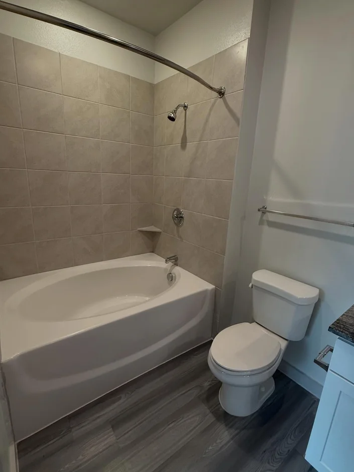 Bathroom construction included waterproofing, tile installation, bathtub and shower enclosures, vanities with stone countertops, mirrors, and all sanitary fixtures. Lighting and ventilation were installed to meet functional requirements. -