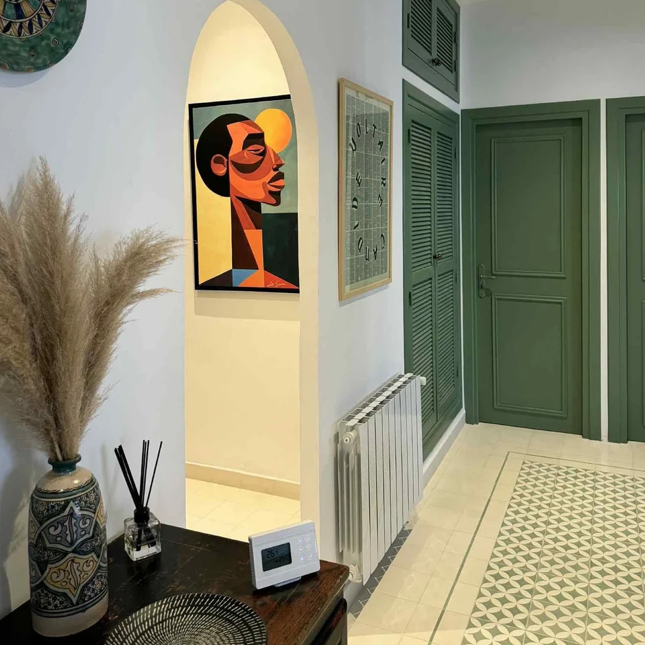 An arched passage introduces softness and rhythm to the layout. We treated it as a focal point by framing it with artwork and warm lighting, turning a simple transition into a memorable architectural moment. -