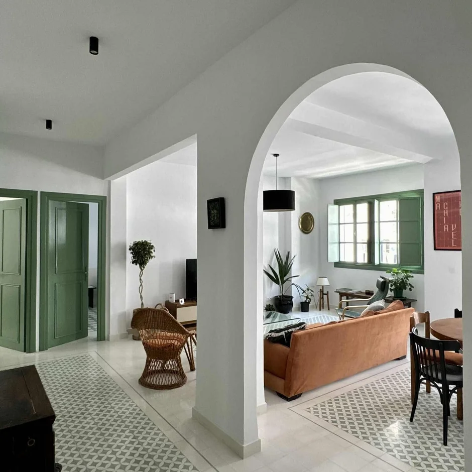 We emphasized the original window and door frames by painting them in a deep green tone. This color anchors the interior, connects visually with the outdoor light, and repeats throughout the apartment to create cohesion. -