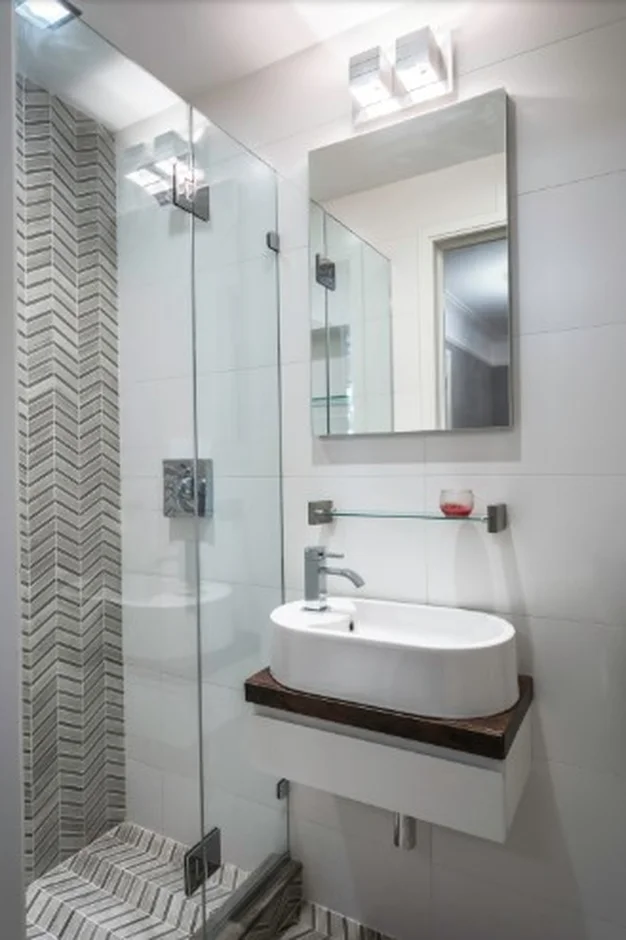 Luxurious bathrooms showcasing geometric mosaic tiles, vessel and undermount sinks, frameless glass showers, and contemporary vanities in wood and dark finishes.