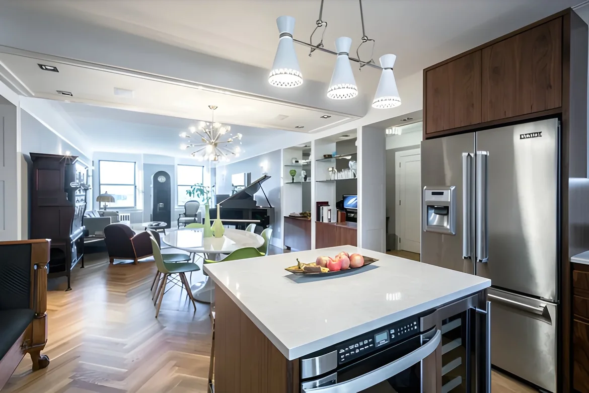 Open kitchen with rich walnut cabinets, marble countertops and island, professional-grade appliances, and striking conical pendant lights.The transformed apartment now exudes elegance and warmth. Standout features include: