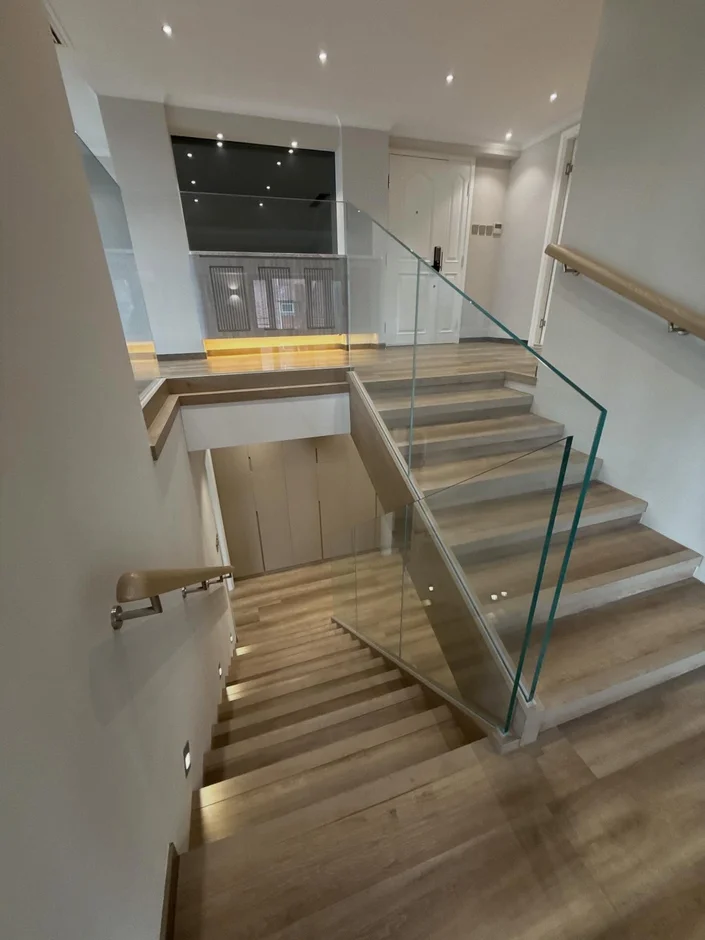 Designed and installed a bespoke internal staircase with solid wood treads and frameless glass balustrades, providing visual lightness while maintaining safety and architectural continuity. -