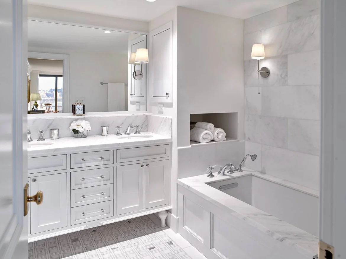 Bathroom overhaul: replaced outdated bathrooms with marble finishes, custom vanities, integrated shelving niches, and refined lighting.