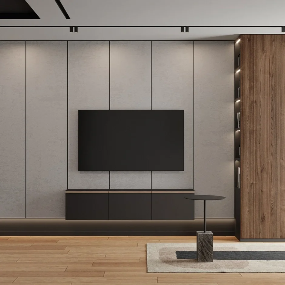 Completed a modern TV wall with decorative panels, a floating media unit, and integrated LED lighting. The living area is complemented by soft furnishings and minimal décor. -