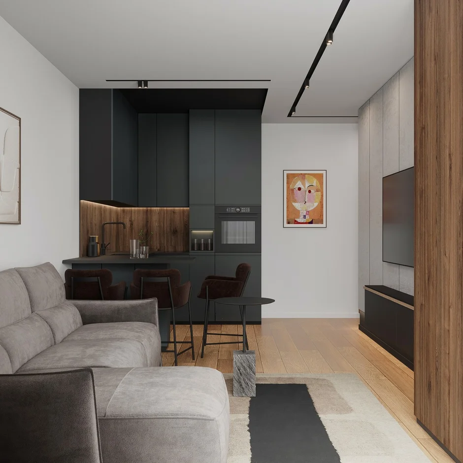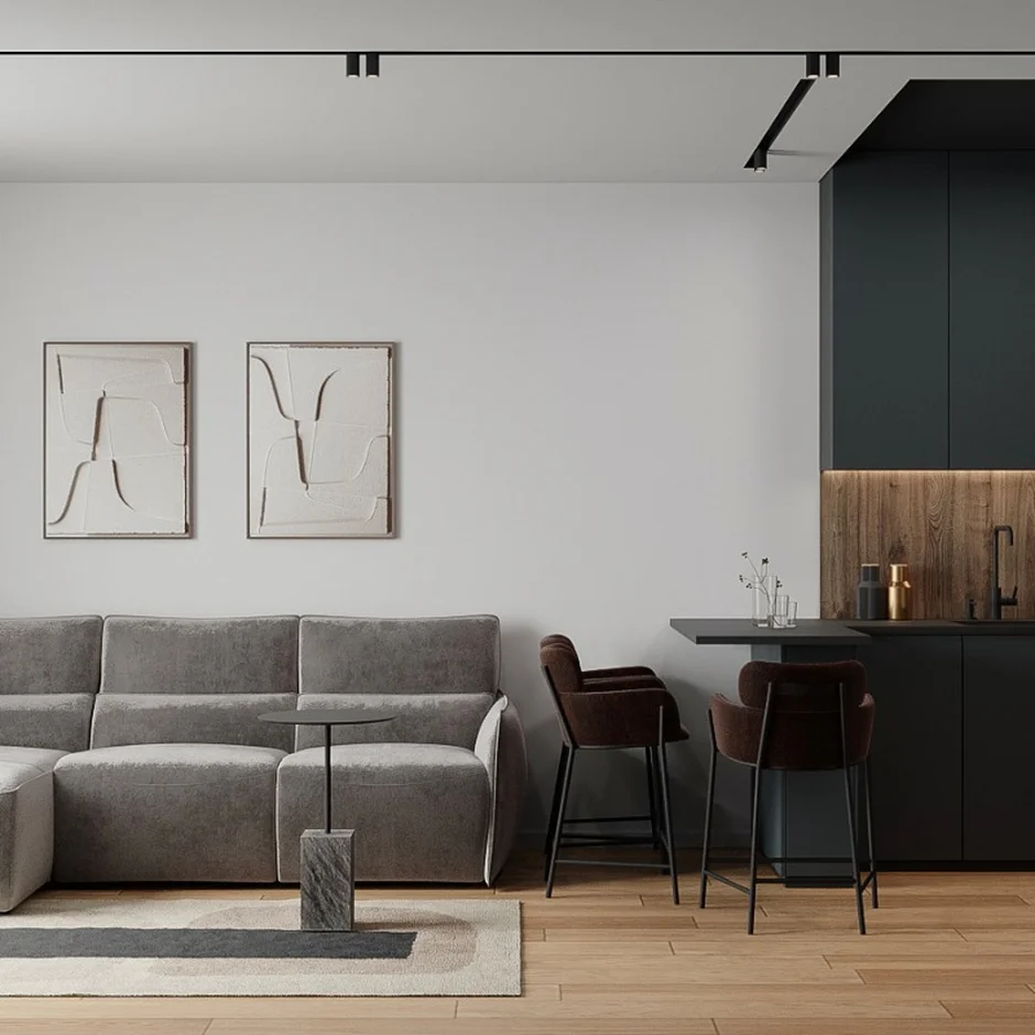 In this project, our team carried out a full-scale apartment renovation with a focus on modern minimalism, clean geometry, and high-quality finishes. The interior combines warm natural wood textures with matte dark surfaces and soft neutral tones, creating a functional, cohesive, and visually balanced living space.