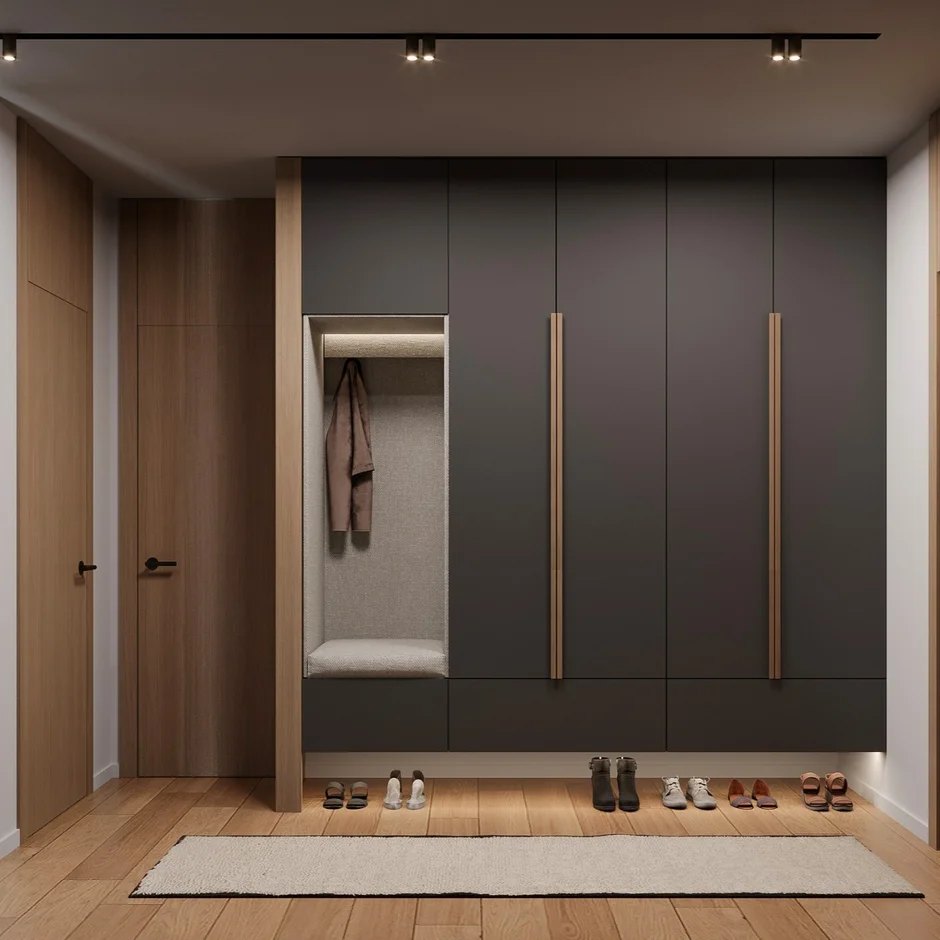 Designed and installed bespoke built-in wardrobes in the hallway with matte finishes, concealed handles, and integrated seating and shoe storage. -