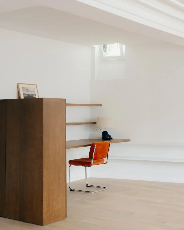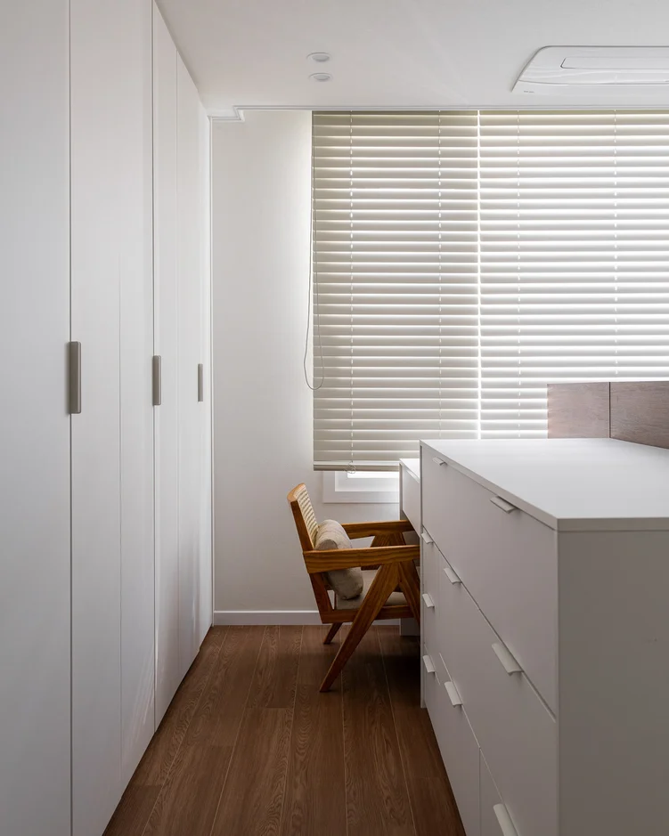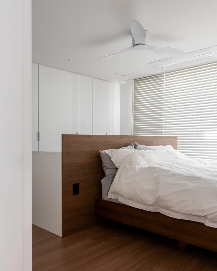 The bedroom features custom-built wardrobes with minimalist facades, forming a seamless plane with the surrounding walls. A bed with a wooden headboard was integrated into the overall interior composition. All furniture elements were manufactured and installed according to project specifications. -