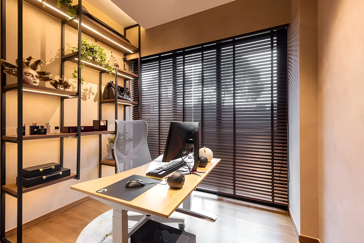 Added a functional home office with open shelving, warm finishes, and controlled task lighting