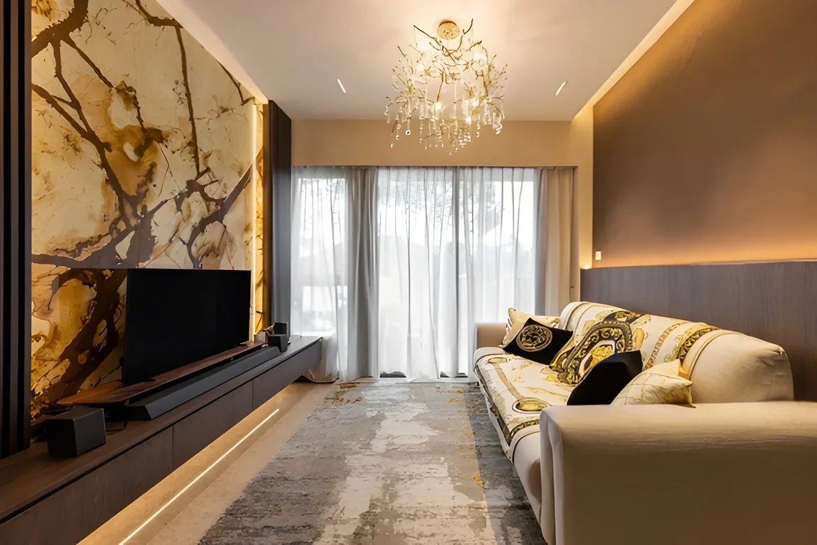 Designed a feature living room with bookmatched stone panels and integrated media wall