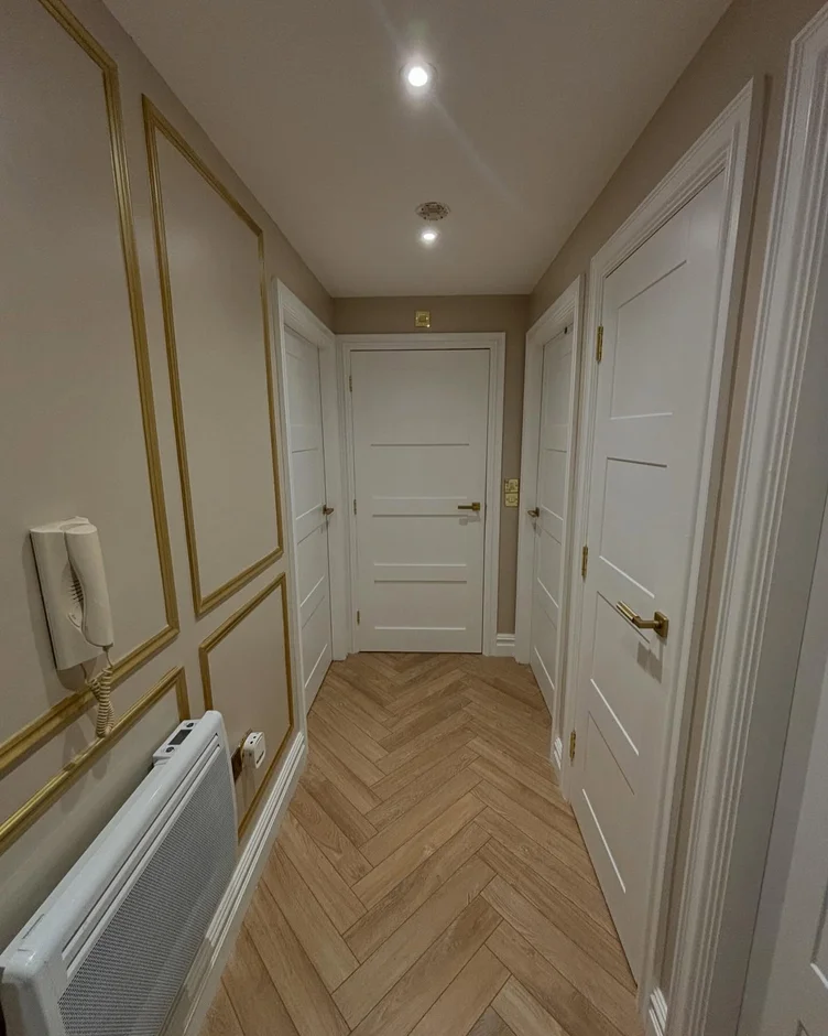 Applied smooth wall finishes and subtle decorative paneling in selected areas. Neutral paint tones and refined detailing contribute to a calm, cohesive interior style. -