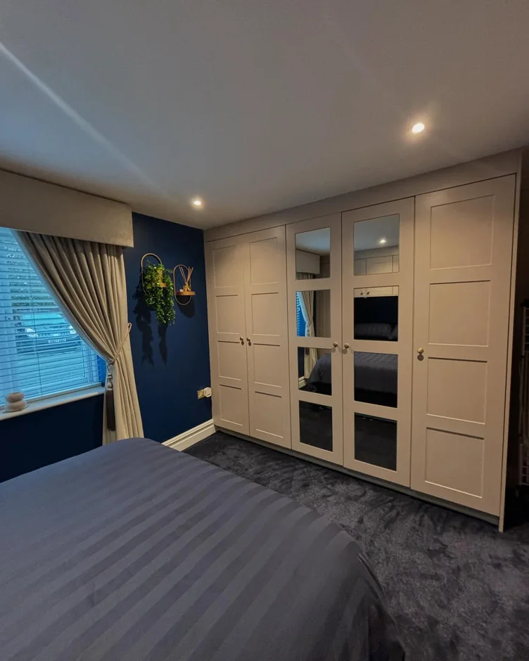 Designed and installed multiple built-in wardrobes and storage units with a combination of solid and mirrored doors. These elements maximize storage capacity while maintaining clean lines and enhancing natural light within the rooms. -