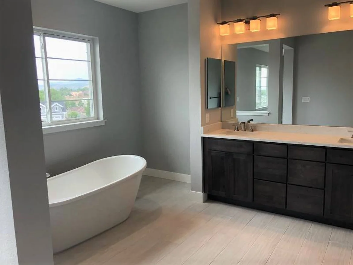 A modern freestanding soaking tub was installed with new plumbing connections and positioned to take advantage of natural light.