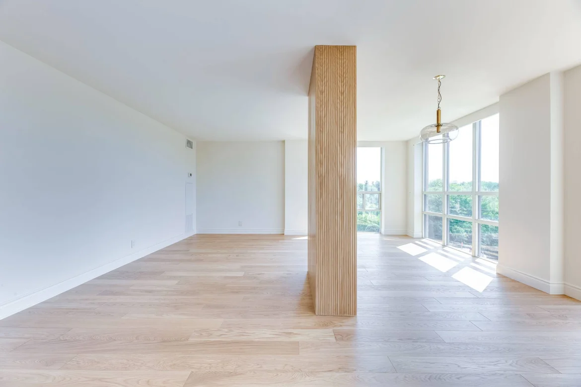 Architectural millwork: Introduced a vertical slat wood feature column to define zones while keeping the layout open and airy.