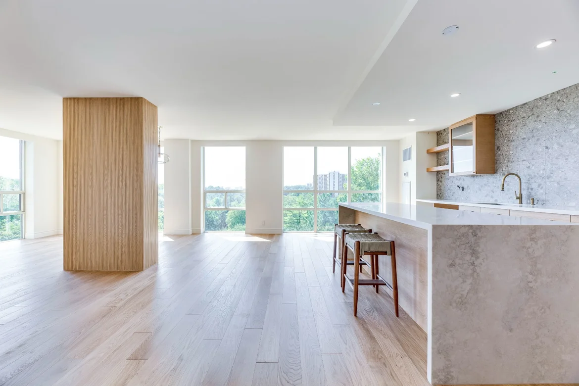 New flooring: Installed wide-plank light oak flooring to warm up the space and visually expand the open plan.