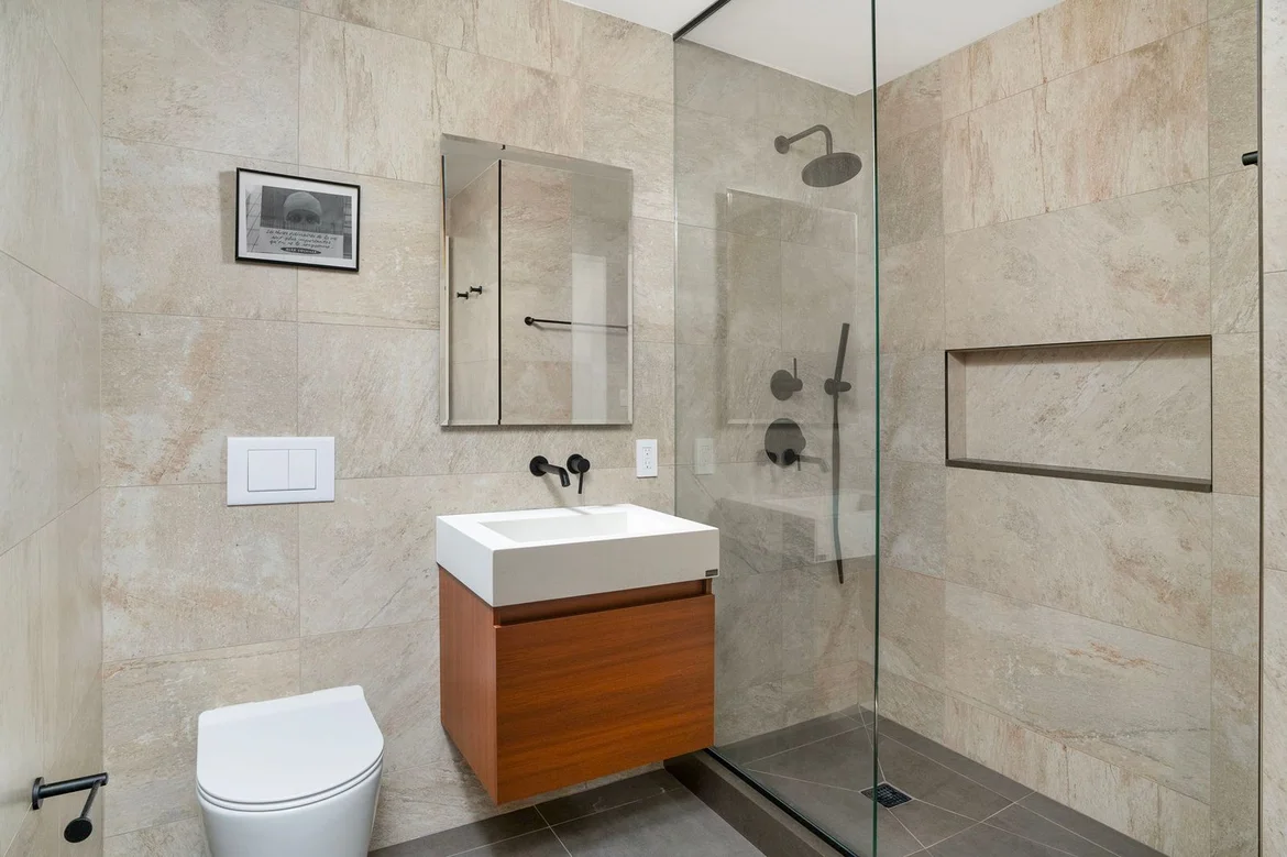 Renovated bathrooms with modern fixtures, frameless glass showers, and neutral tile palettes.