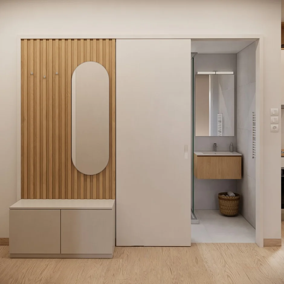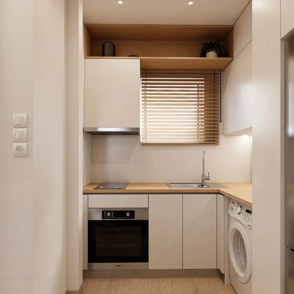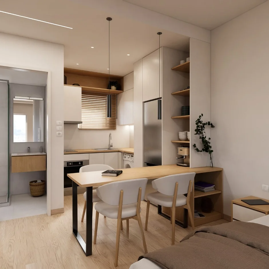 Wood-effect flooring was installed throughout the living and sleeping areas, providing warmth and visual continuity. In the bathroom, moisture-resistant finishes were applied. All transitions between materials were carefully detailed for durability and everyday use.