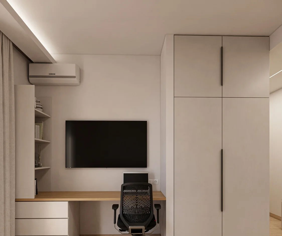 Ceilings were finished with smooth matte surfaces and equipped with recessed lighting to provide even illumination. A designer ceiling fan was installed, combining functional ventilation with a subtle decorative accent.