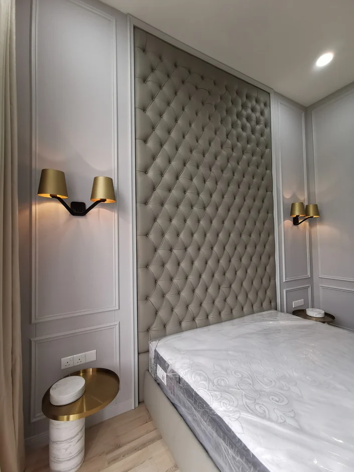 The bedroom underwent a complete interior upgrade, including wall and ceiling preparation, new flooring, and decorative wall paneling. A full-height upholstered feature wall was constructed behind the bed, creating a refined focal point and enhancing acoustic comfort. New recessed ceiling lighting and wall-mounted sconces were installed to provide balanced illumination and highlight architectural details.