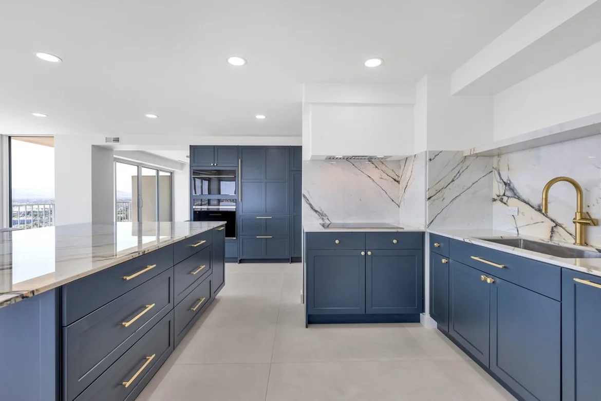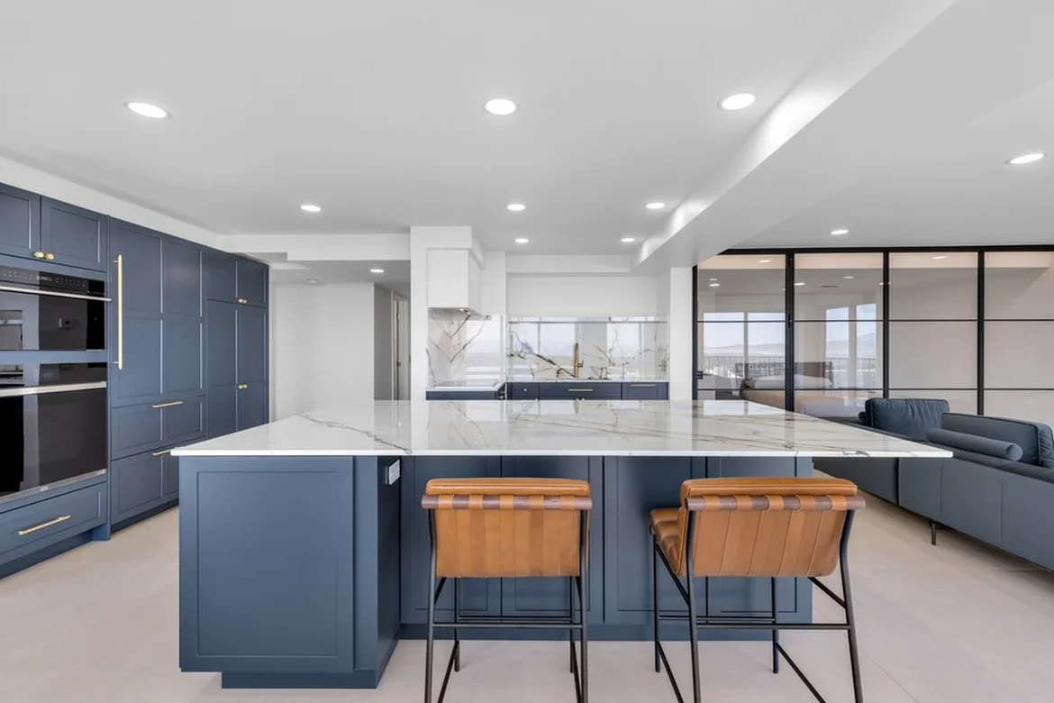 The kitchen was upgraded with custom blue shaker-style cabinetry, soft-close drawers, and modern brass hardware. A quartz waterfall island with a marble-veined finish was installed, serving as both a functional workspace and a central gathering area.