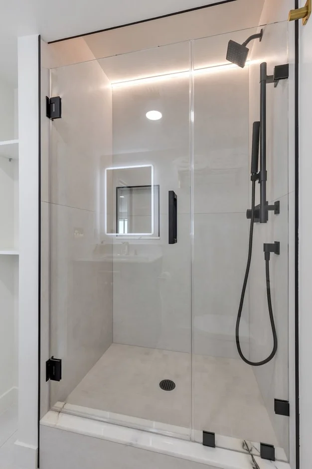 The bathroom was fully remodeled with a walk-in glass shower enclosure, large-format wall tiles, waterproofed shower base, and modern matte black fixtures, including a rainfall shower system for a clean, spa-inspired look.