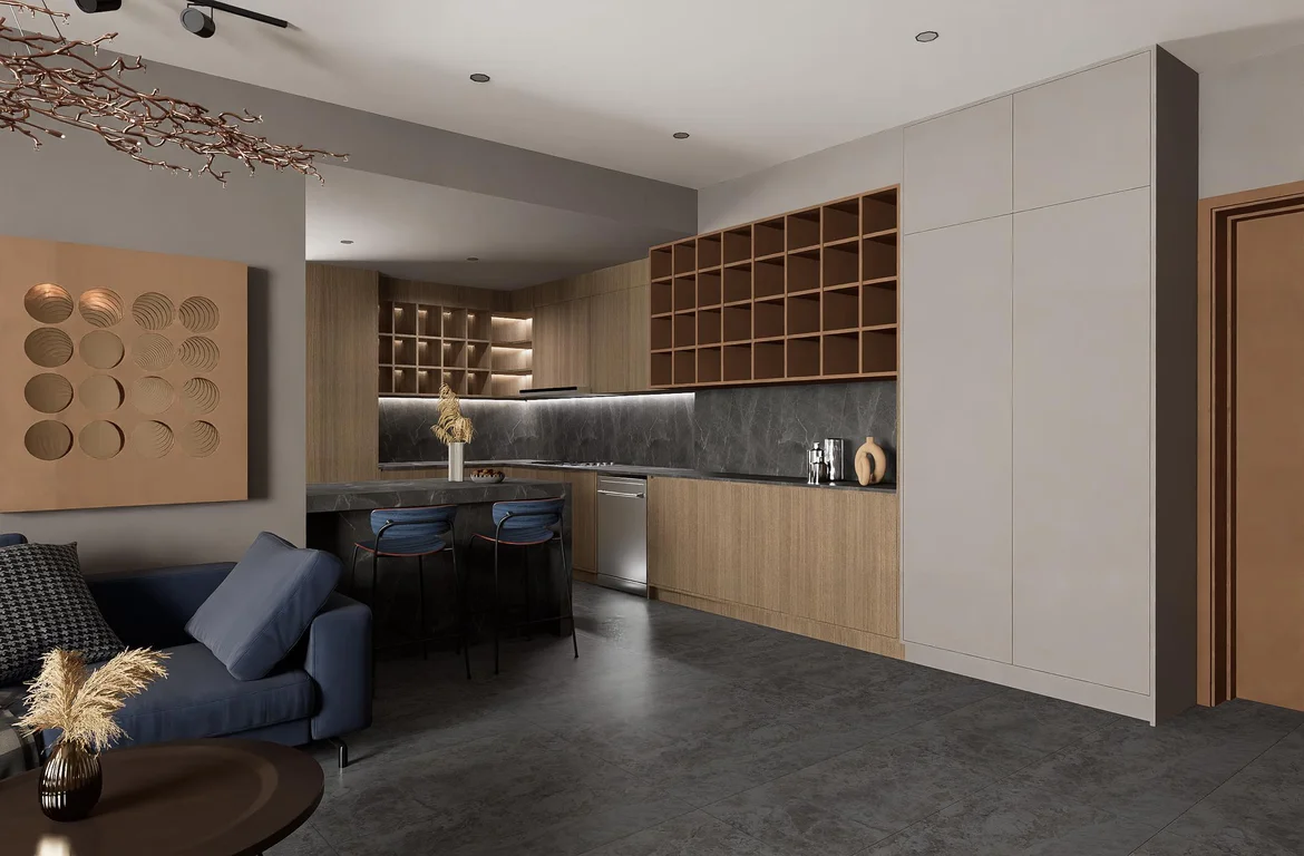 Designed an open-plan layout that seamlessly connects the living room and kitchen while preserving visual structure. The transition between zones is defined through material changes and furniture placement rather than physical barriers. -
