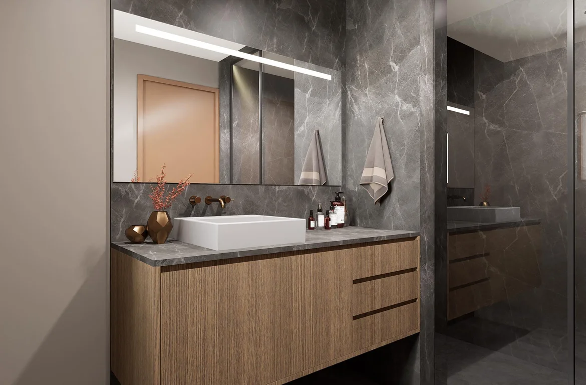Completed a modern bathroom with large-format marble-look wall tiles, a floating vanity with wood finish, and a vessel sink. Integrated mirror lighting and minimal fixtures create a clean and refined atmosphere. -