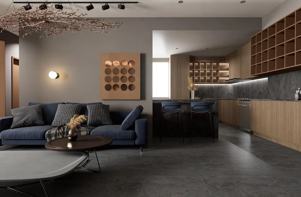 Installed stone-look flooring throughout the apartment, providing visual continuity and a durable foundation. The flooring reinforces the contemporary aesthetic while supporting practical everyday use. -