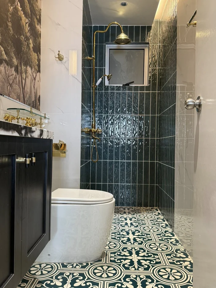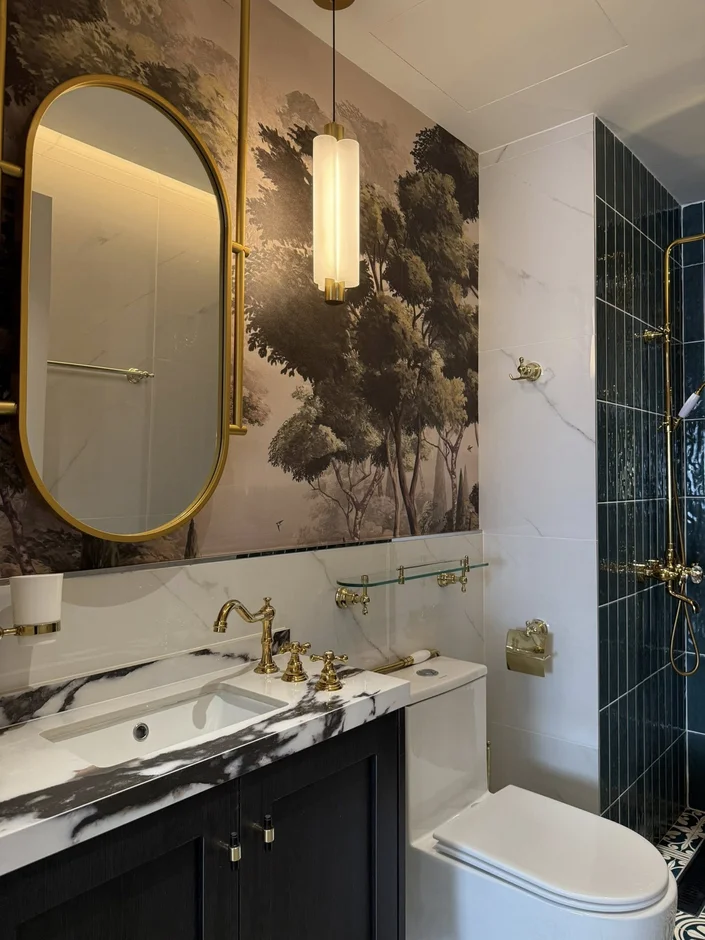 This bathroom renovation delivers a luxurious, artistic, and timeless atmosphere through a combination of deep tones, bold textures, and elegant brass details. The mix of marble, handcrafted-style tiles, and scenic wall art transforms the space into a boutique-style retreat.