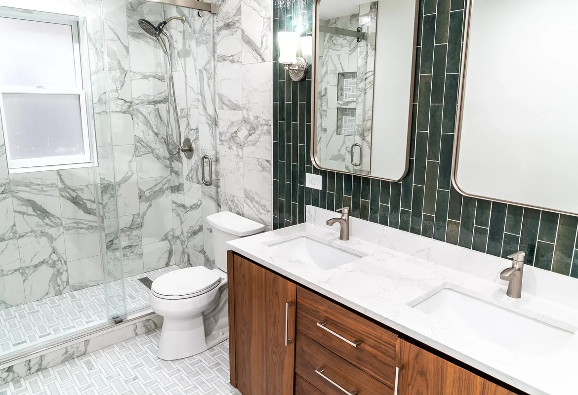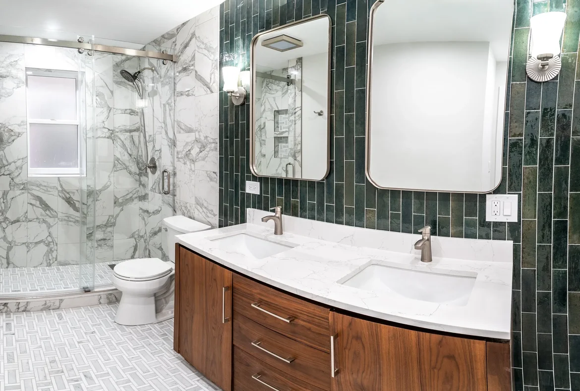 A custom double-sink vanity with rich wood cabinetry and soft-close drawers was installed. The vanity was paired with a white quartz countertop featuring subtle veining, providing both durability and a clean, upscale appearance.