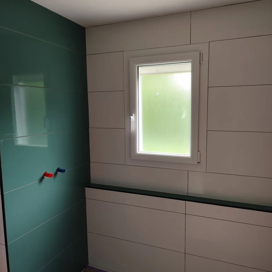 Designed a spacious walk-in shower with a seamless low-profile base and clear glass partition. The vertical green accent tiles introduce depth and character, becoming a subtle focal point while maintaining a minimalist feel. -