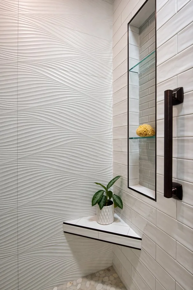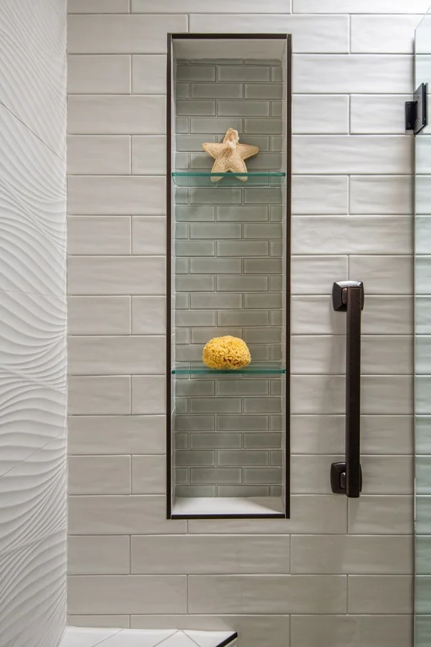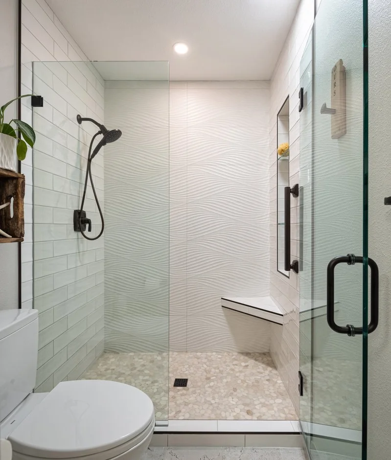The shower area was fully waterproofed and reconstructed with new backer board systems. The walls were retiled using a combination of textured wave-pattern tiles and modern subway tiles to create a clean, dimensional look. A custom-built shower niche with glass shelves and a corner bench was added for functional storage and comfort. A frameless glass door system with matte-black hardware completes the shower transformation.