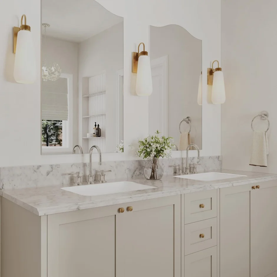 Introduced a round wall-mounted mirror to soften the geometry of the space and create a refined focal point above the vanity. -