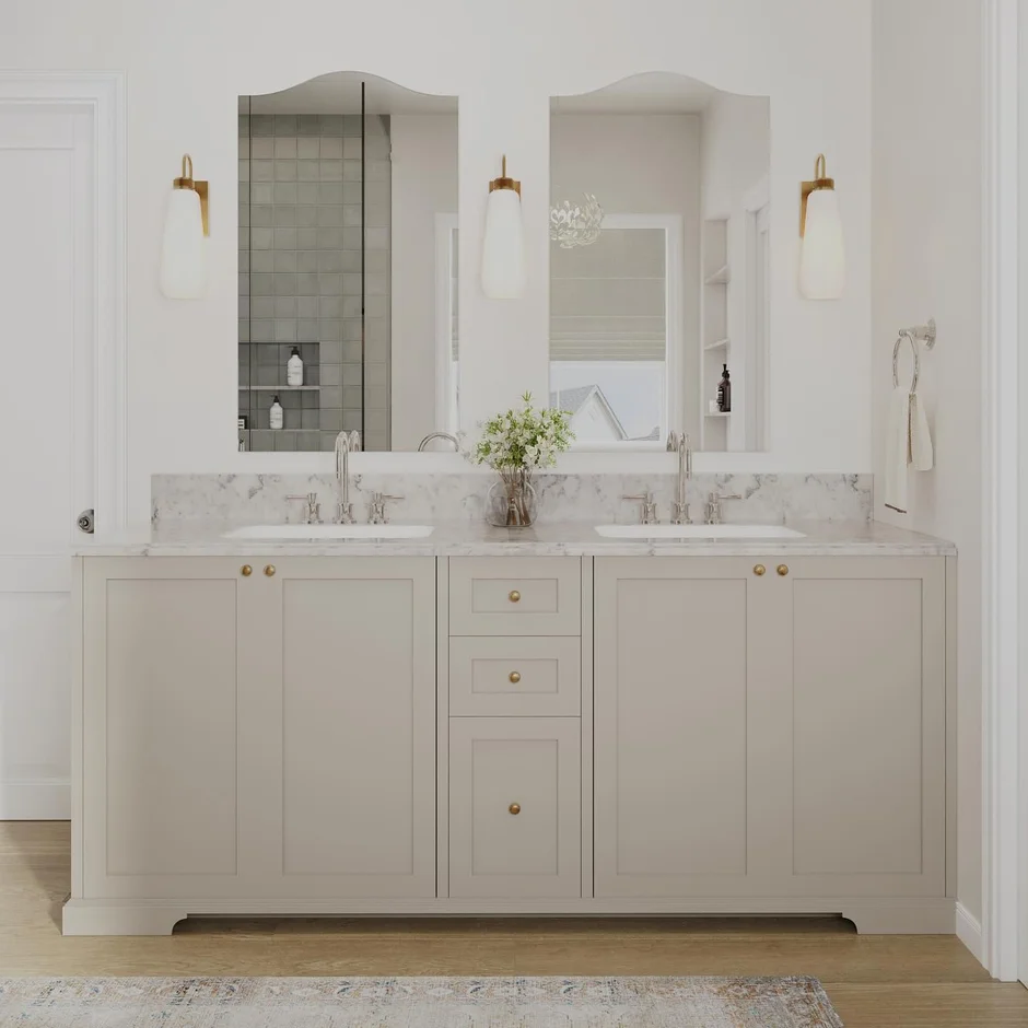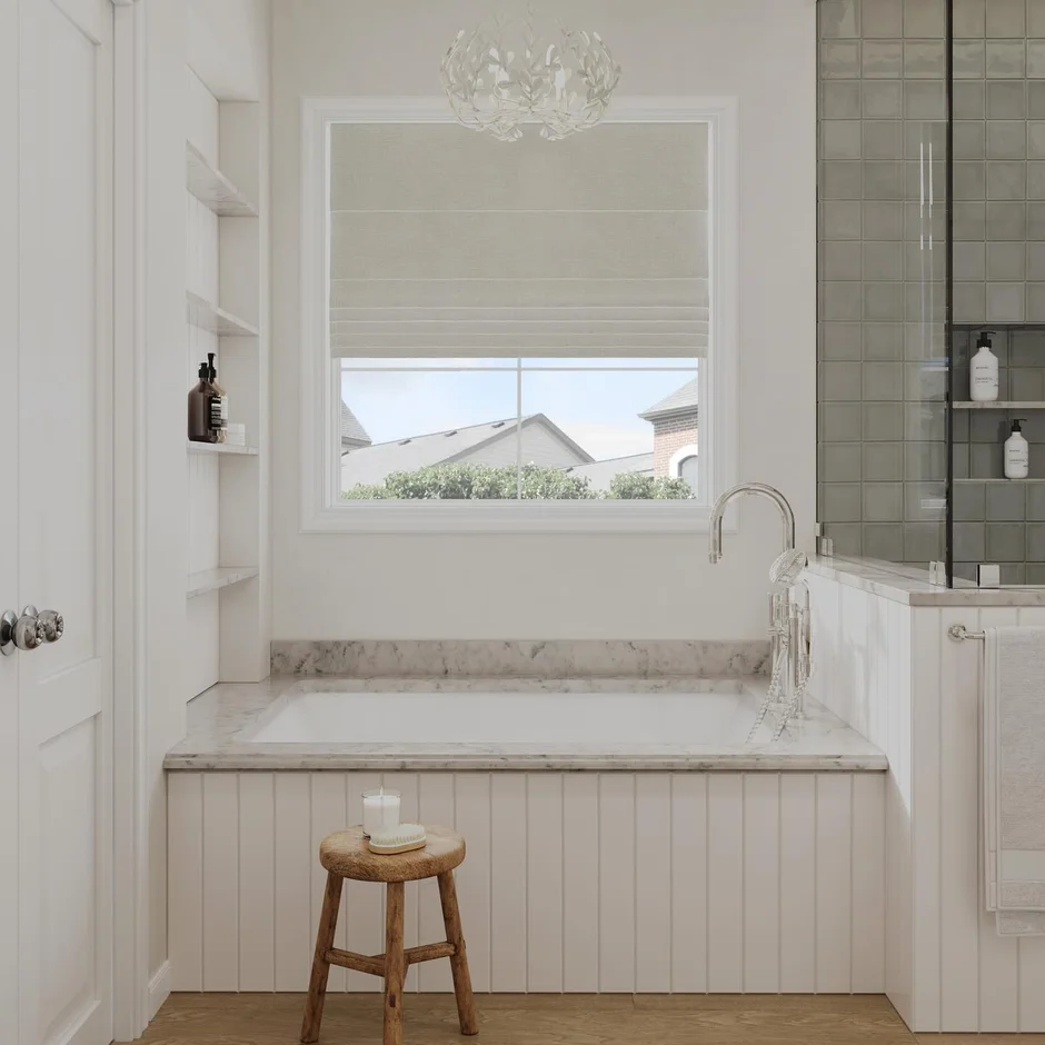 Updated the space with a harmonious blend of warm greys, off-whites, and subtle beige tones. This palette enhances natural light and creates a serene, spa-like atmosphere. -