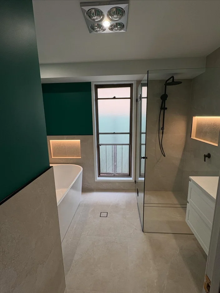 This bathroom renovation blends bold contemporary style with calm, spa-like elegance. The deep emerald walls create a dramatic contrast with the soft beige tiles, while clean white fixtures keep the space bright and modern.