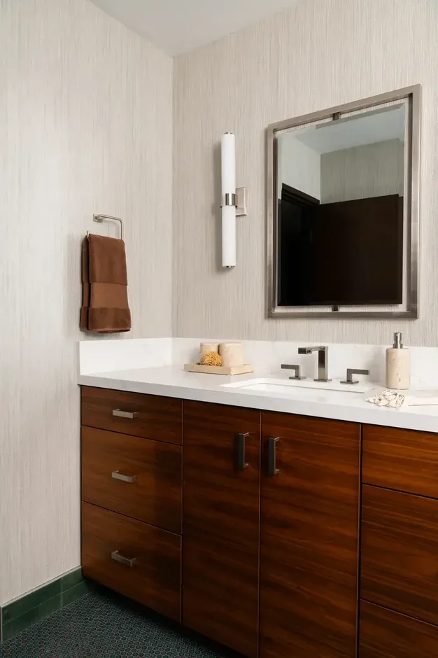 We replaced the old vanity with a custom wood cabinet featuring modern slab drawers, soft-close hardware, and significantly more storage. The warm walnut tone adds natural richness to the room.