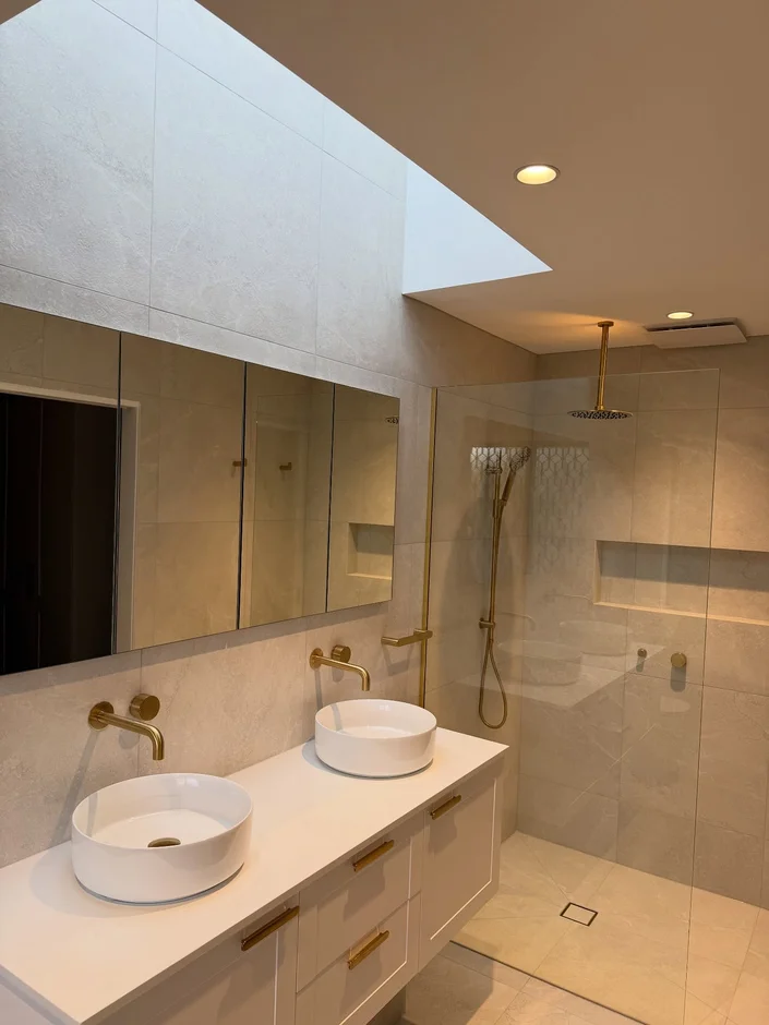 Built a spacious walk-in shower featuring a rainfall head, handheld sprayer, and sleek wall-mounted controls—all in brushed gold. This combination introduces an elevated, luxurious touch that contrasts beautifully with the neutral tile palette. -
