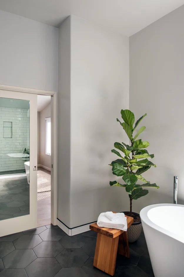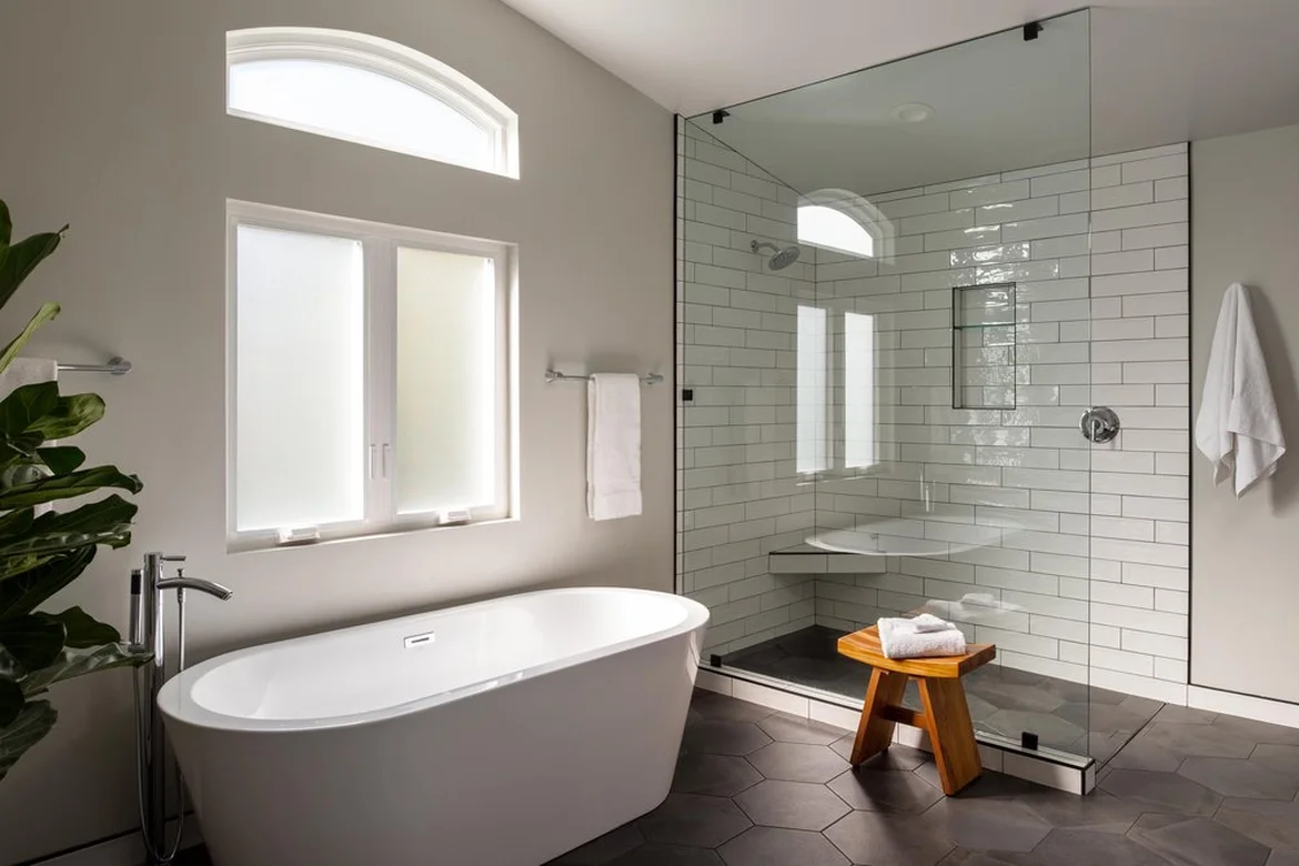 Existing plumbing lines were updated to accommodate the new freestanding bathtub, dual-sink vanity, and shower system. All valves, drains, and supply lines were replaced or repositioned as needed. New fixtures—including the freestanding tub filler, dual faucets, and shower hardware—were installed and pressure-tested.