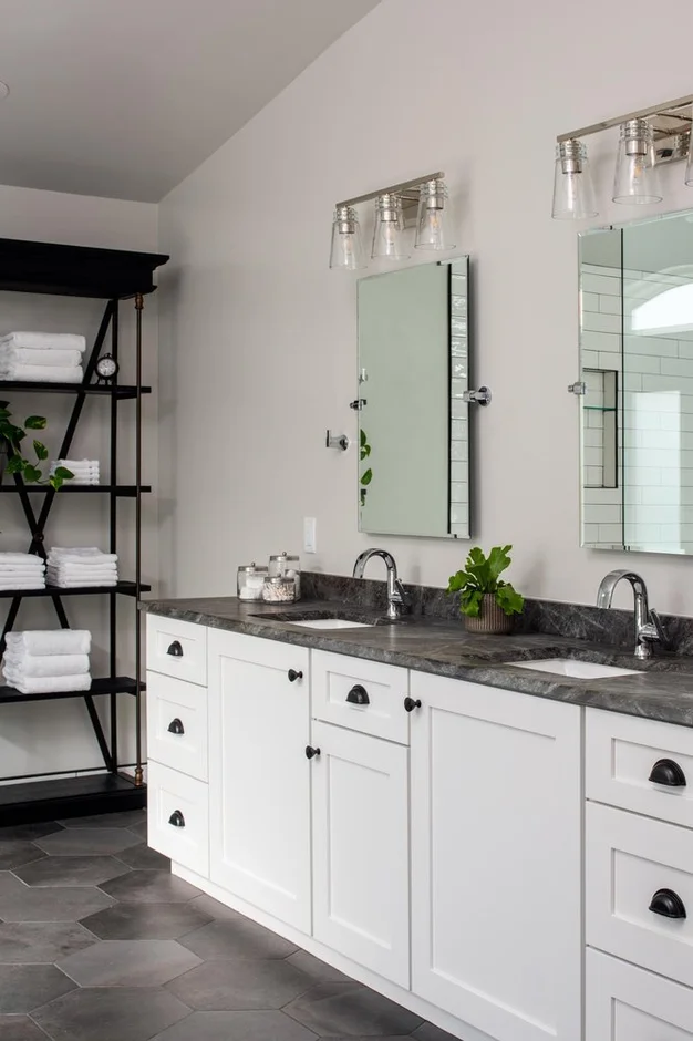 The outdated vanity was removed and replaced with custom white cabinetry featuring shaker-style doors. A durable stone countertop was installed along with two undermount sinks. A freestanding shelving unit was also added to provide accessible storage and complement the updated layout.