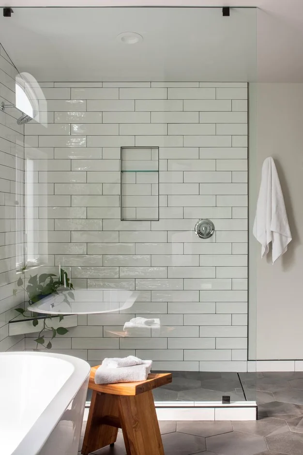 All wall surfaces were stripped, leveled, and refinished. In the shower area, a complete waterproofing system was applied before installing new subway wall tiles with precise alignment. A built-in niche and a floating corner bench were added for enhanced functionality. The shower enclosure was finished with a frameless glass panel for an open, modern look.