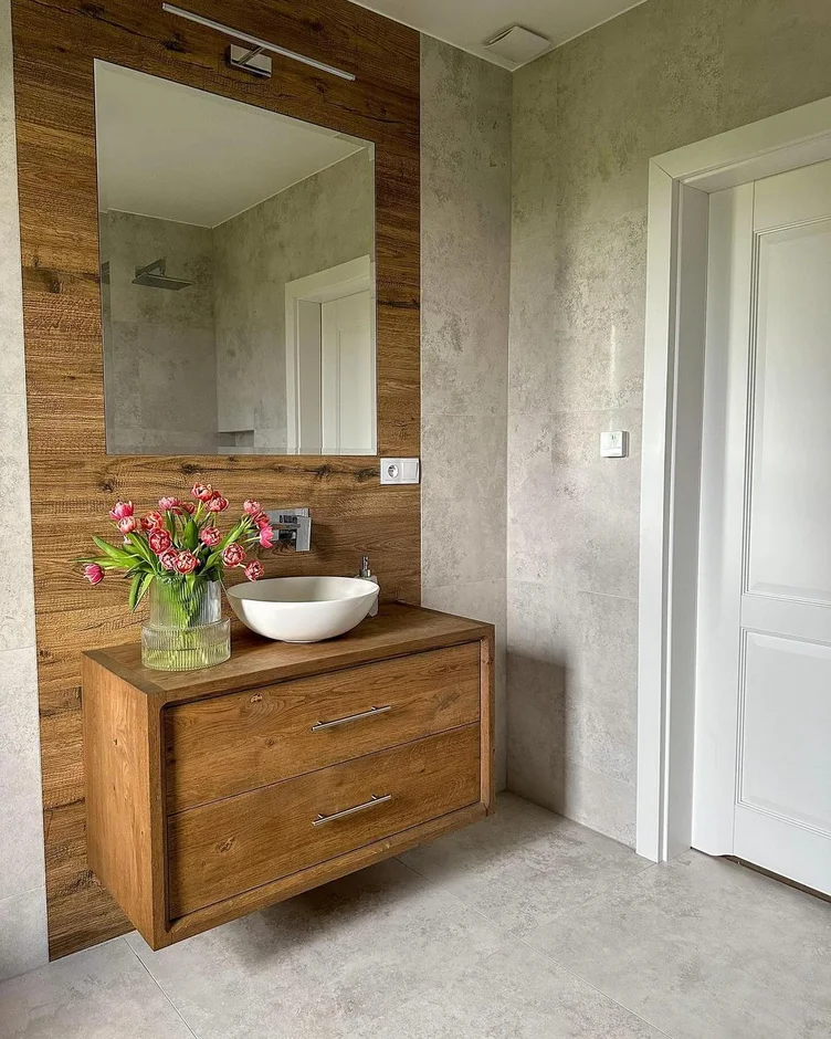 Applied wood-look wall panels inside the shower area to add warmth and visual contrast while maintaining moisture resistance and durability. -