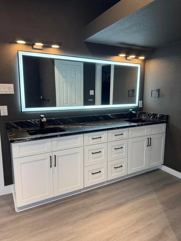 Added a full-width LED backlit mirror to brighten the space and highlight the dramatic dark wall color. -