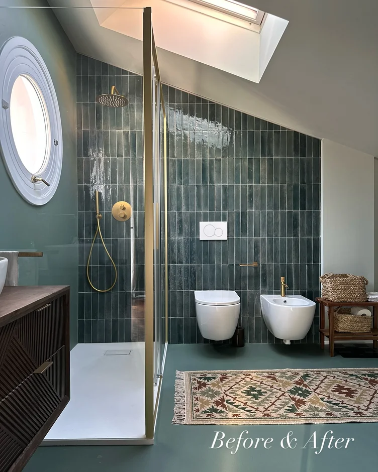 This renovation transforms an attic bathroom into a refined, atmospheric retreat defined by deep green tones, handcrafted finishes, and elegant brass details. The updated layout and material palette emphasize comfort, visual harmony, and contemporary functionality while celebrating the unique architecture of the sloped ceiling and round window.