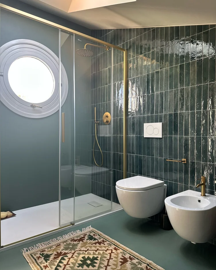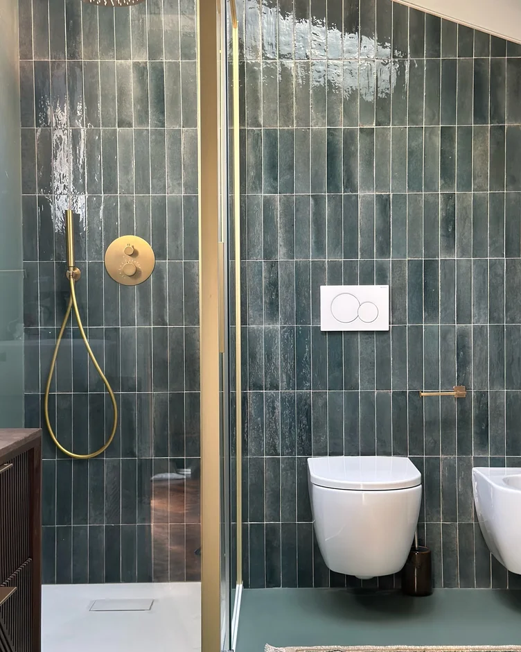 Installed vertically laid, handcrafted green ceramic tiles that create depth, texture, and a striking visual focal point in the shower and toilet area. Their glossy finish enhances light reflections and adds a luxurious artisanal feel. -