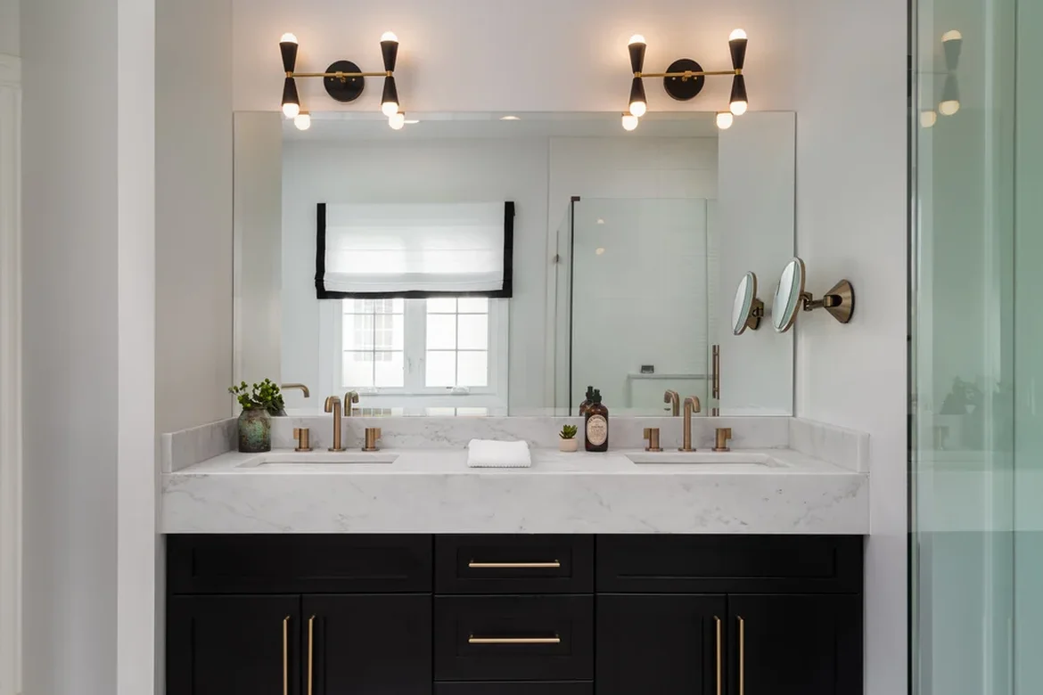 Lighting was upgraded with new wall-mounted sconces above the mirror, providing balanced and functional illumination. Electrical components were updated to support the new lighting layout.