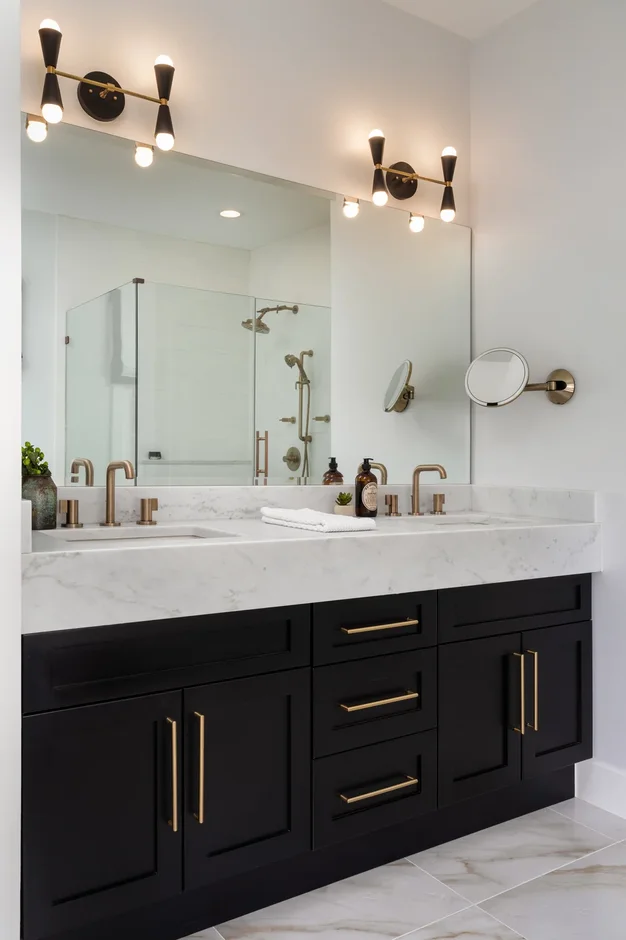 A new custom double-sink vanity with dark cabinetry was installed, offering increased storage and a bold contrast to the light finishes. The vanity is topped with a quartz countertop featuring subtle veining for a refined, modern look.