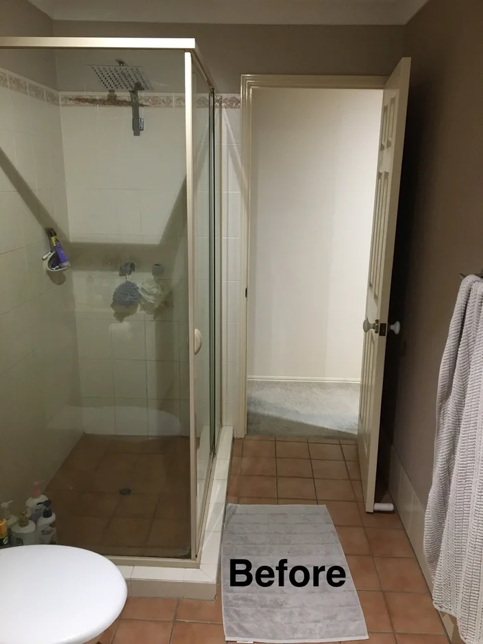 Replaced the old framed shower with a sleek walk-in design featuring large stone-look tiles, a linear drain, and elegant brushed fixtures for a minimalist, hotel-inspired feel. -
