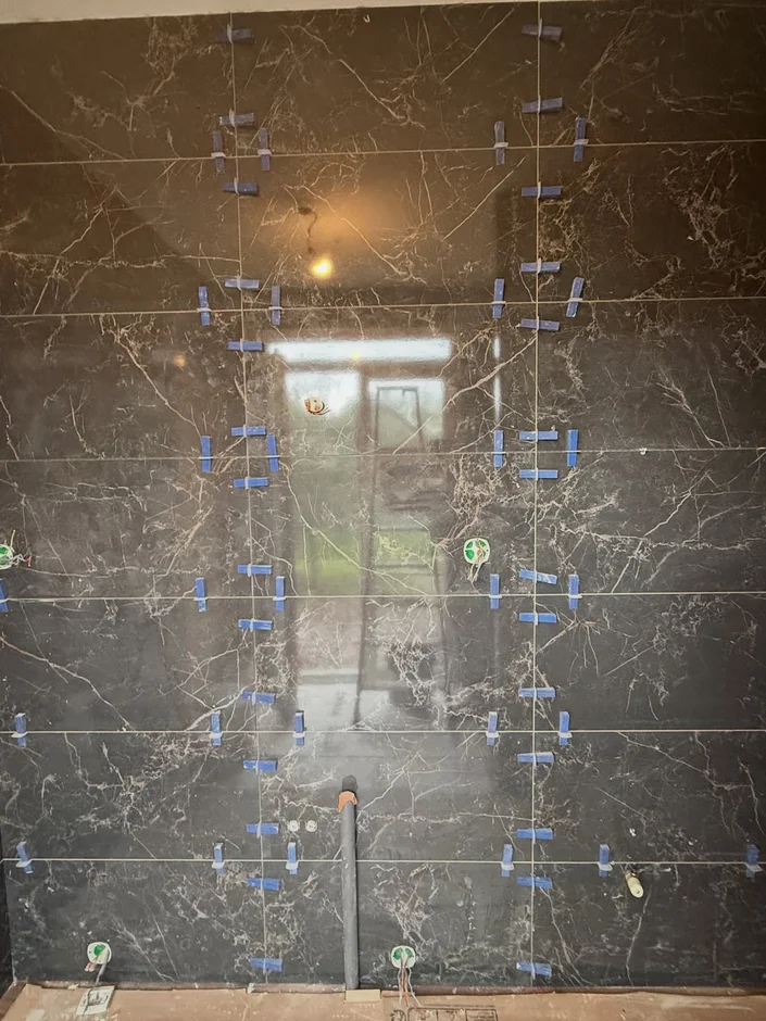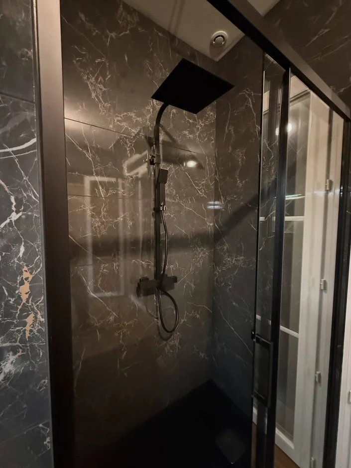 Installed large-format marble-effect panels in deep charcoal tones, creating a seamless and dramatic shower zone. The reflective finish and natural veining add depth, sophistication, and a premium spa-like feel. -