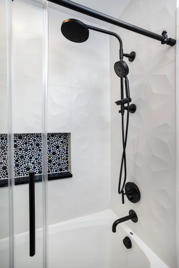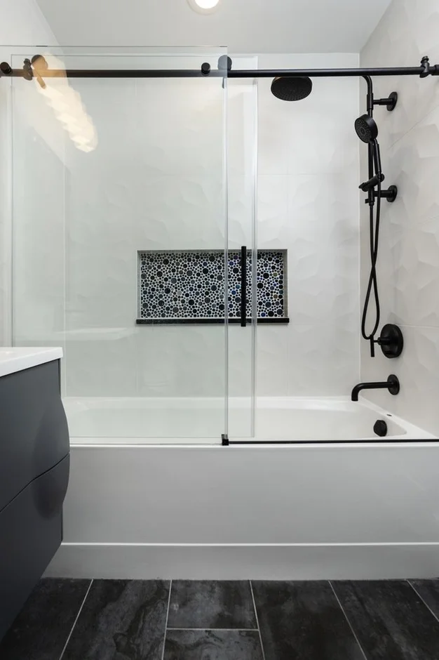 The bathtub and shower walls were fully retiled with modern white textured tiles, creating a sleek and contemporary look. A custom recessed niche with decorative mosaic accent tile was added for convenient storage and visual interest. A new sliding glass shower door completes the upgraded shower area.